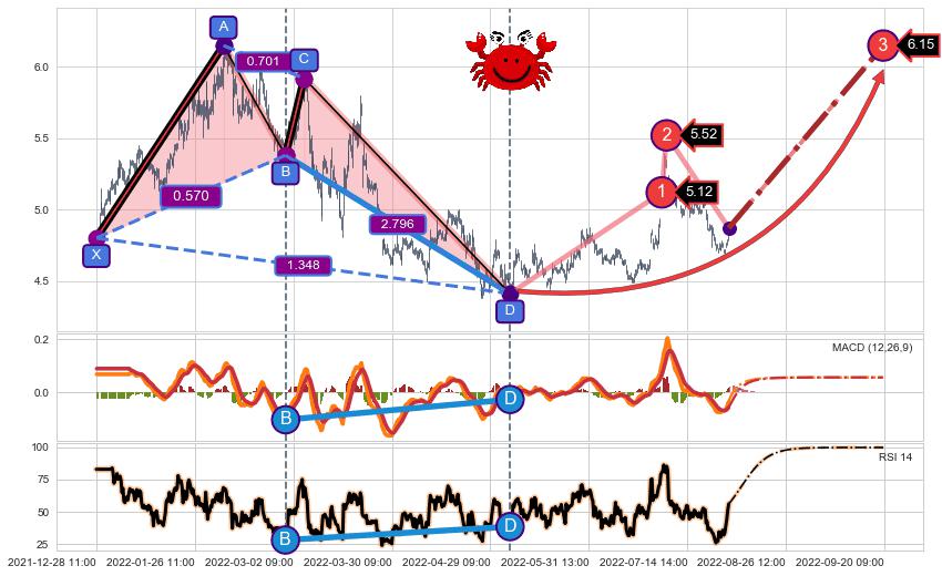 ➢ 谐波价格D点比B点低 ⤵,【MACD】指标D点比B点高 ⤴️