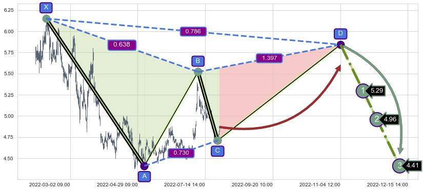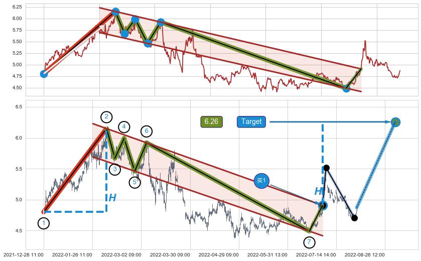 ➣ D点拟合预测价格5.84,距离最后交易收盘价格4.87相差 +19.96%