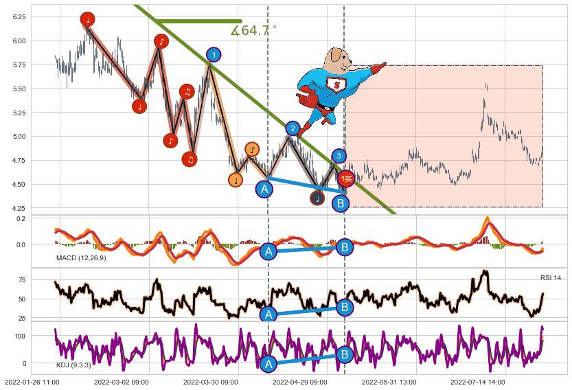 从2022-02-10 10:00至2022-05-30 09:00,共包含364个小时,阶段股价下跌-21.34%,阶段股价变动位移路程比: 1 : 15,下跌趋势角度: 64.7