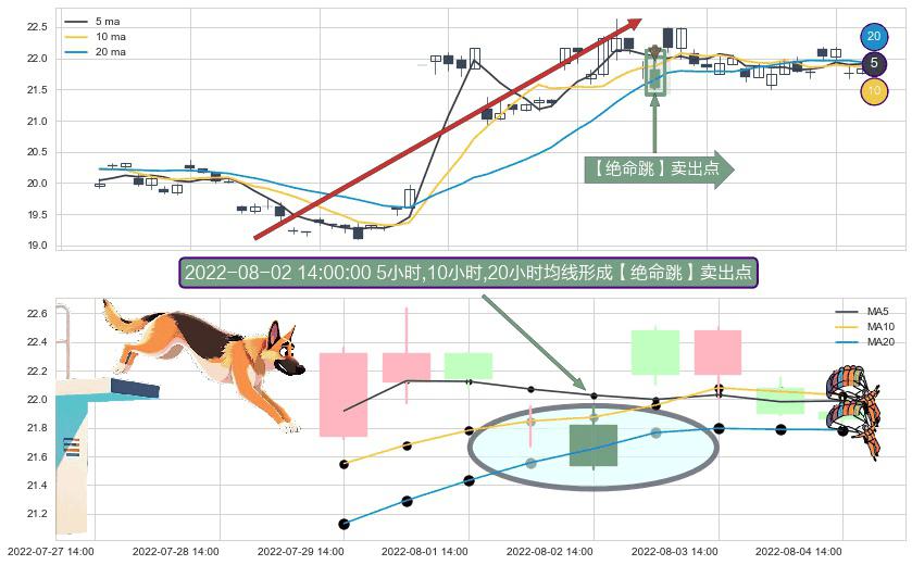 ⚀ 2022-08-02 14:00:00小时显现 5小时-10小时-20小时均线 【绝命跳】卖出点 看空信号,后市看跌,卖出