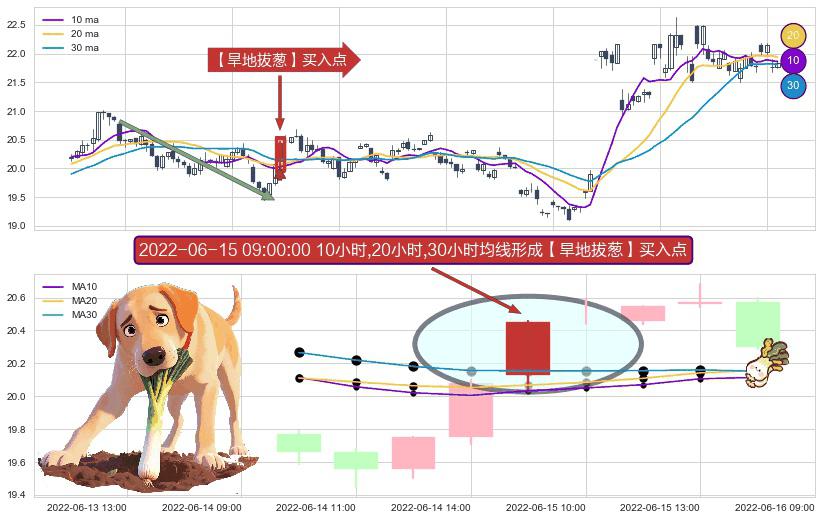 ⚀ 2022-06-15 09:00:00小时显现 10小时-20小时-30小时均线 【旱地拔葱】买入点 看多信号,后市看涨,买入