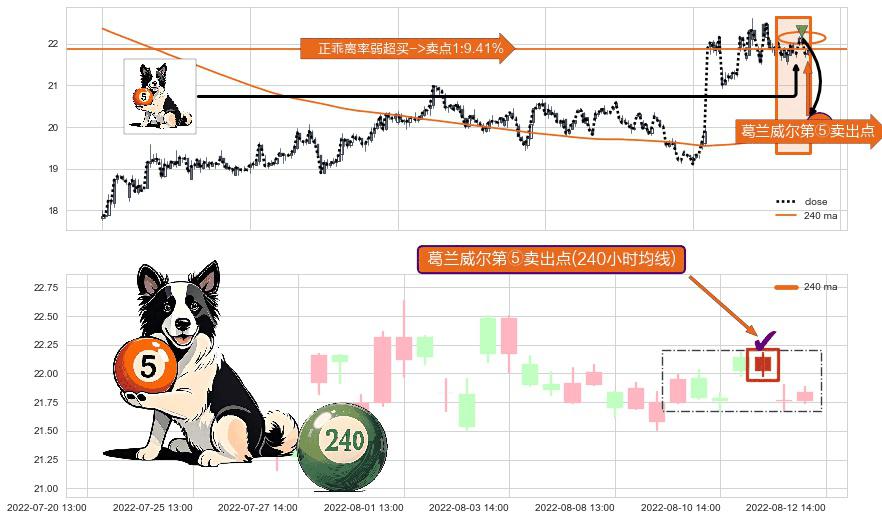 ⚀ 2022-08-11 14:00:00-小时显现 葛兰威尔均线 240小时均线 第⑤卖出点 上升趋势均值回复的短线回落信号,后市看跌,卖出信号