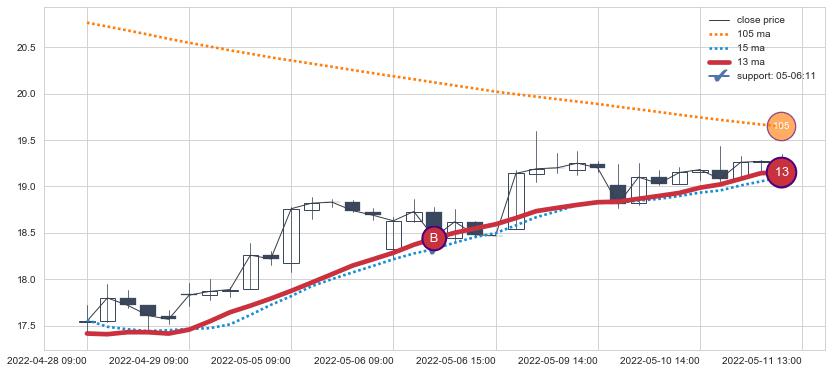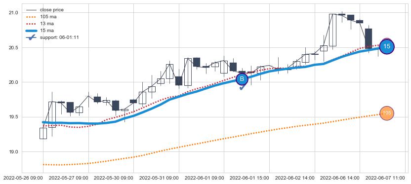 ⚂ 2022-06-17 14:00:00小时突然冒出一根大阳线,一下子顶穿三条均线且收盘价收在各条均线之上