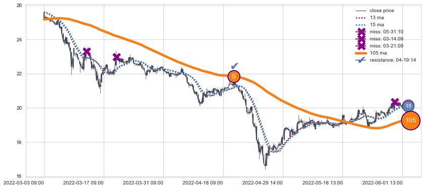 ⚃ 2022-06-17 14:00:00小时开盘价格在三条均线下收大阳线,收盘全突破均线,收盘股价上涨0.25%