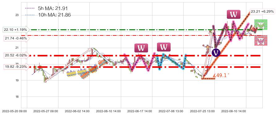 ➢ 【仅预测突破】最后价格:21.84与预测突破价格:22.48→【空间中等】后续最小【整理】第一目标价格→(08-16:11: 23.97 )