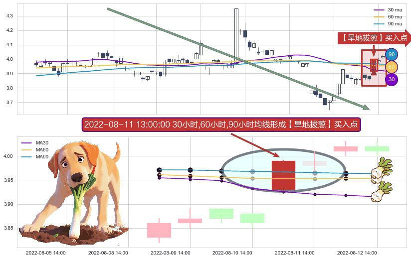 ⚀ 2022-08-11 13:00:00小时显现 30小时-60小时-90小时均线 【旱地拔葱】买入点 看多信号,后市看涨,买入