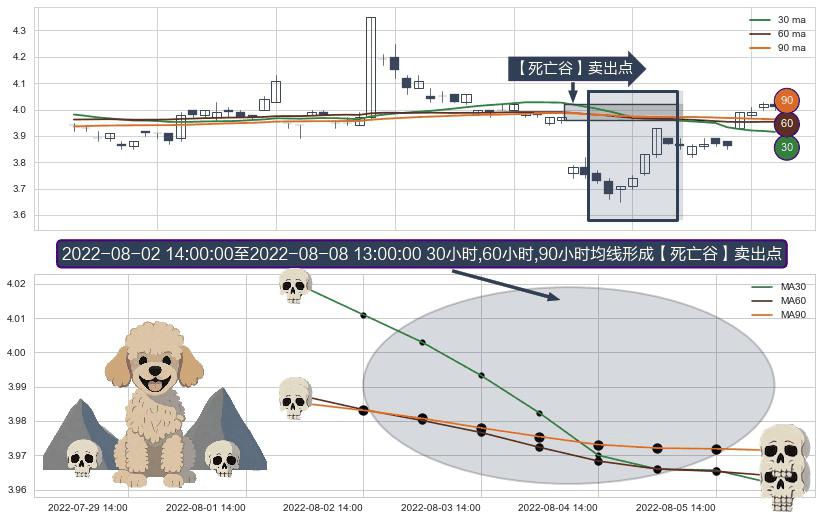 ⚀ 2022-08-03 13:00:00-小时至2022-08-08 13:00:00-小时显现 30小时-60小时-90小时均线 【死亡谷】卖出点 看空信号,后市看跌,卖出