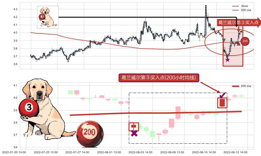 ⚀ 2022-08-11 13:00:00-小时显现 葛兰威尔均线 200小时均线 第③买入点 上升趋势的中继信号,后市看涨,买进信号