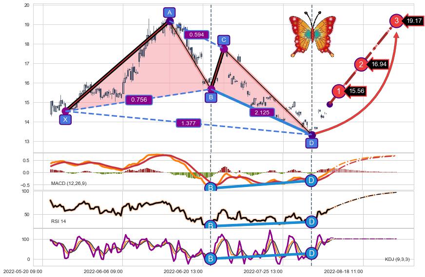 | 2 🅚:【高山滑雪】买入点 ➕ 📡:谐波蝴蝶已到达d点:猜想c下行到达d点后报复性拉升上涨(均值回复) ☞ 看多信号 ⇥ 【均线】交织【图形】⇥ 综合量化分数: 52 | > |