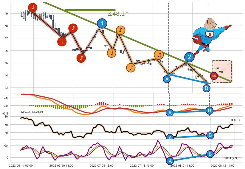 ➣ 2022-06-13 14:00-2022-08-12 13:00下跌趋势存在反转上涨[机会],其原下跌趋势的阻力位(13.52)已被突破[强支撑信号],原下跌趋势角度: 48.1˚