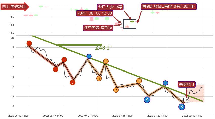从2022-06-13 14:00至2022-08-12 13:00,共包含100个小时,阶段股价下跌-22.72%,阶段股价变动位移路程比: 1 : 6,下跌趋势角度: 48.1,2022-06-20 13:00向↘︎形成缺口,跳空下跌-8.11%˚