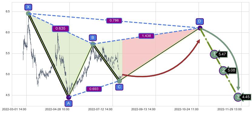➣ D点拟合预测价格6.11,距离最后交易收盘价格4.99相差 +22.35%
