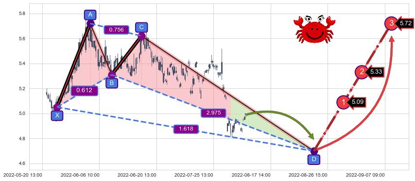 ➢ 距离预测D点位置尚有下跌空间,短线依然【看跌】, 耐心等待看涨【螃蟹】形态反转启动