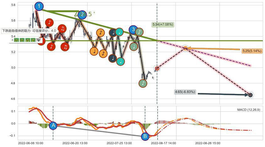 ➣ 预测:2022-09-02 15:00,【继续下探】稳定目前下跌趋势的前提下,预测价格:4.65