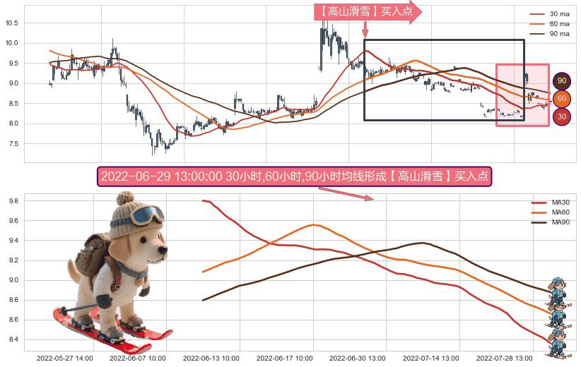 ⚀ 2022-06-09 10:00:00小时-2022-08-01 14:00:00小时显现 30小时-60小时-90小时均线 【高山滑雪】买入点 看多信号,后市看涨,买入