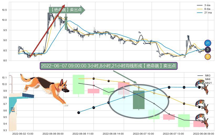 ⚀ 2022-06-07 09:00:00小时显现 3小时-8小时-21小时均线 【绝命跳】卖出点 看空信号,后市看跌,卖出