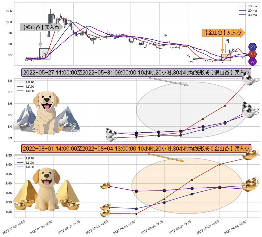 ⚃ 2022-08-02 13:00:00-小时至2022-08-04 13:00:00-小时显现 10小时-20小时-30小时均线 【金山谷】买入点 其再次确认了买入信号,可靠性更强,买入
