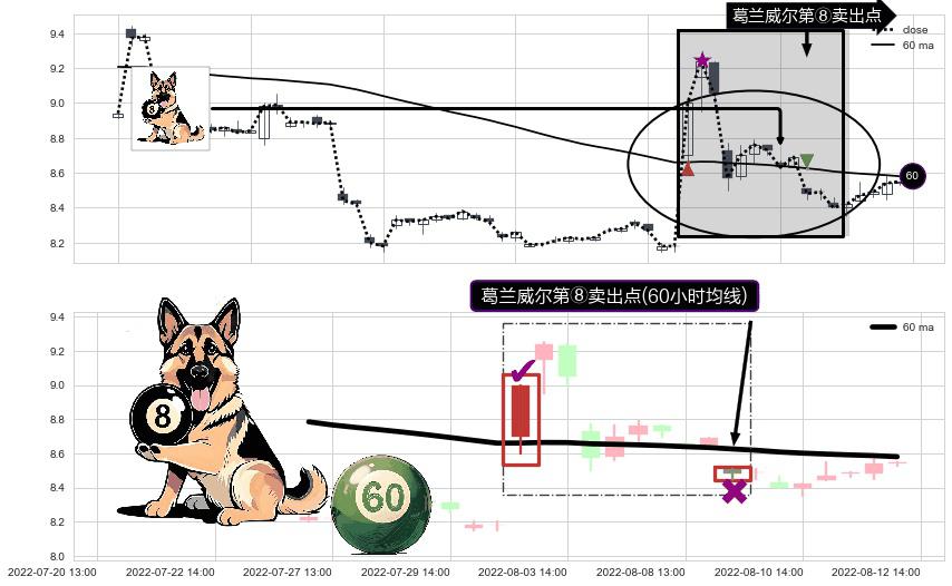 ⚀ 2022-08-09 13:00:00-小时显现 葛兰威尔均线 60小时均线 第⑧卖出点 下降趋势的中继信号,后市看跌,卖出信号