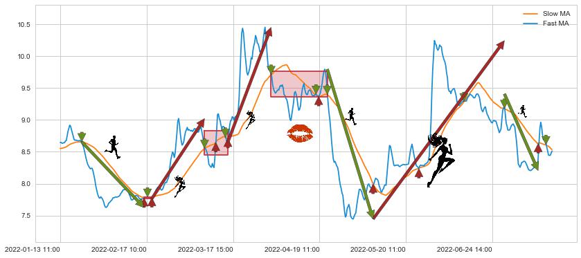 04-21 10:00至05-10 14:00 慢线与快线呈空头排列, 慢线与快线接触少,无缠绕