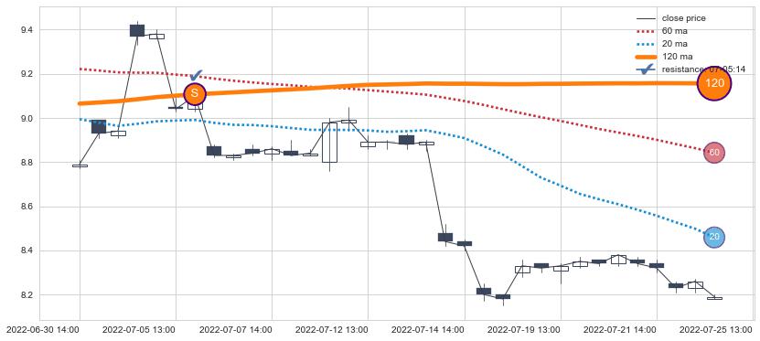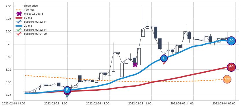 ⚂ 2022-08-02 13:00:00-小时均线向上突破,2022-08-09 13:00:00-小时重新下穿均线破位,均线阻力再次生效