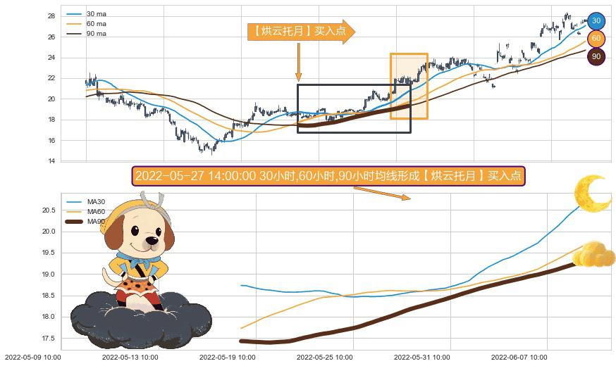⚀ 2022-05-18 13:00:00小时-2022-06-08 14:00:00小时显现 30小时-60小时-90小时均线 【烘云托月】买入点 看多信号,后市看涨,买入