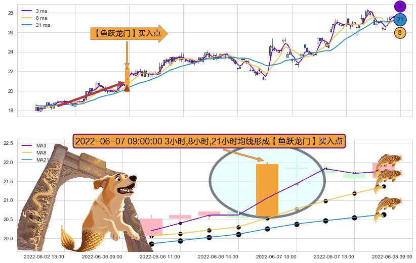 ⚀ 2022-06-07 09:00:00小时显现 3小时-8小时-21小时均线 【鱼跃龙门】买入点 看多信号,后市看涨,买入