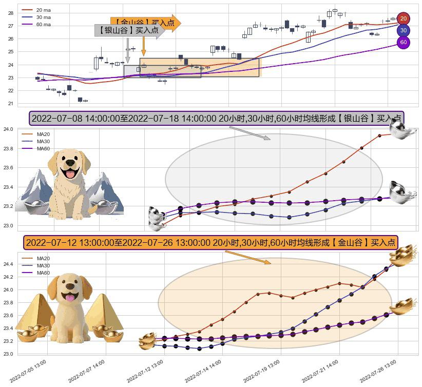 ⚃ 2022-07-12 14:00:00-小时至2022-07-26 13:00:00-小时显现 20小时-30小时-60小时均线 【金山谷】买入点 其再次确认了买入信号,可靠性更强,买入