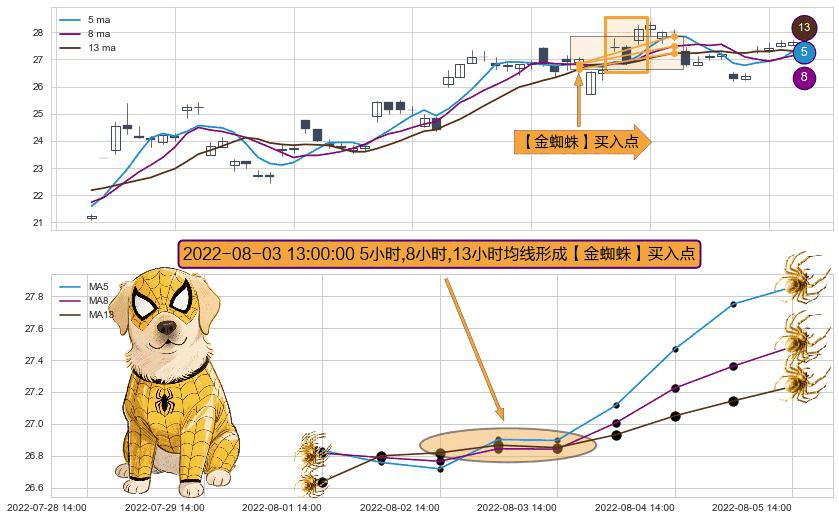 ⚀ 2022-08-03 13:00:00小时显现 5小时-8小时-13小时均线 【金蜘蛛】买入点 看多信号,后市看涨,买入