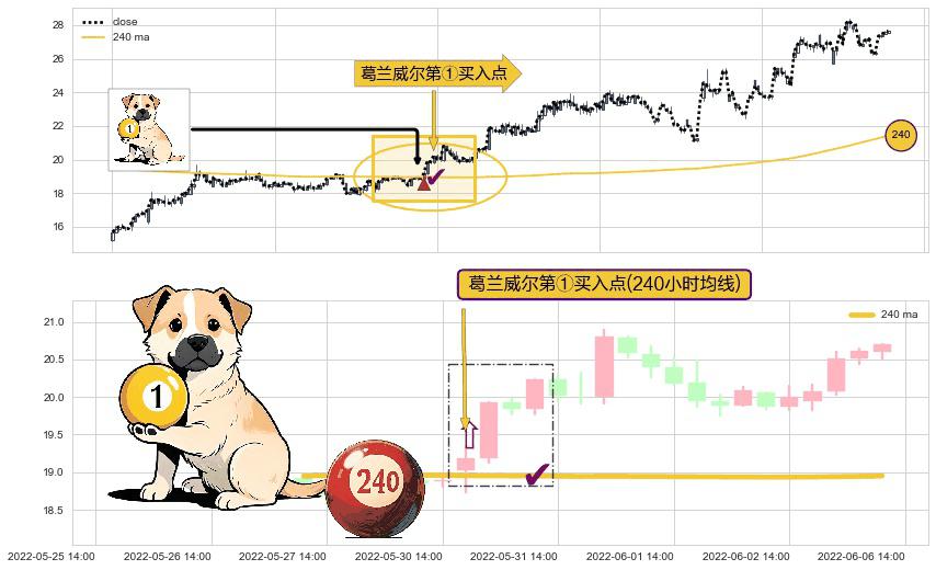 ⚀ 2022-05-31 09:00:00-小时显现 葛兰威尔均线 240小时均线 第买①入点 走势反转见底信号,后市看涨,买进信号