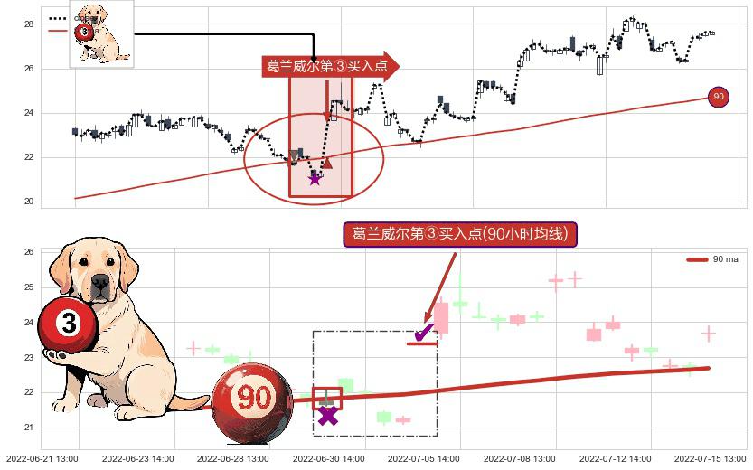 ⚀ 2022-07-04 13:00:00-小时显现 葛兰威尔均线 90小时均线 第③买入点 上升趋势的中继信号,后市看涨,买进信号