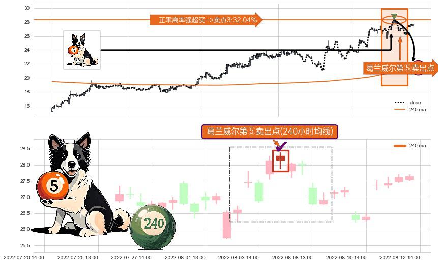 ⚀ 2022-08-04 14:00:00-小时显现 葛兰威尔均线 240小时均线 第⑤卖出点 上升趋势均值回复的短线回落信号,后市看跌,卖出信号
