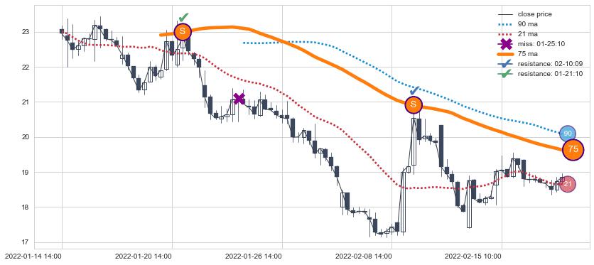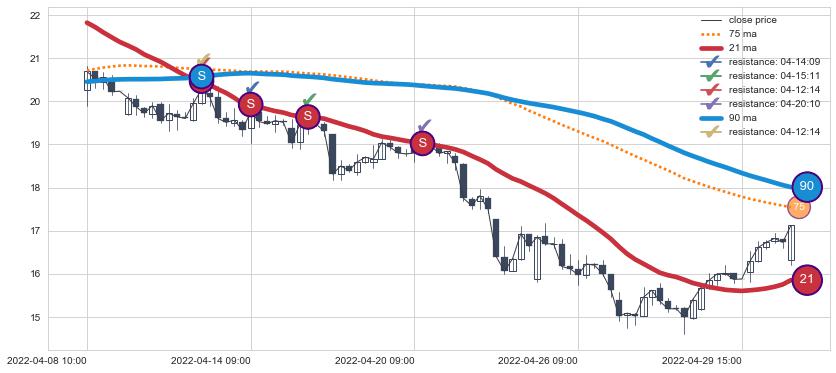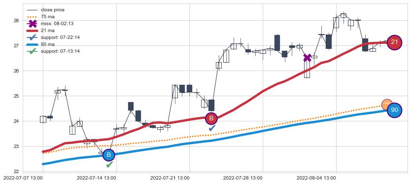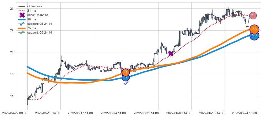 ⚂ 2022-06-29 14:00:00-小时均线向下破位,2022-07-04 13:00:00-小时重新上穿突破均线,均线支撑再次生效