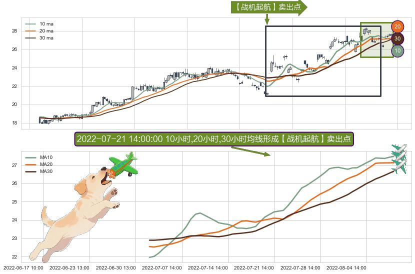⚀ 2022-07-01 14:00:00小时-2022-08-09 14:00:00小时显现 10小时-20小时-30小时均线 【战机起航】卖出点 看空信号,后市看跌,卖出