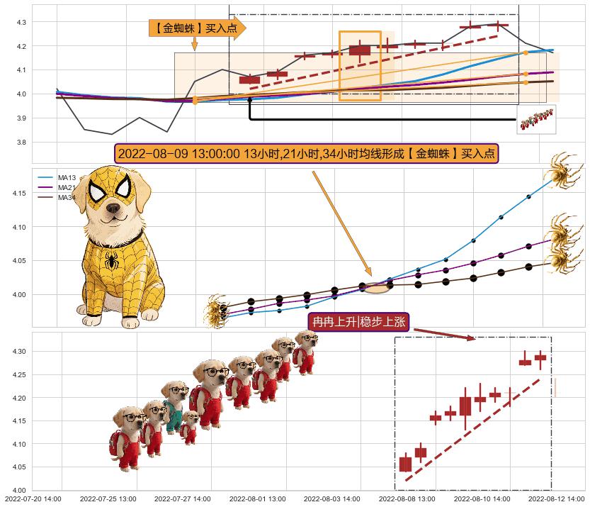 从2022-04-27 09:00至2022-08-12 14:00,共包含249个小时,阶段股价上涨32.50%,阶段股价变动位移路程比: 1 : 6,上涨趋势角度: 22.3,2022-06-20 13:00向⇪形成缺口,跳空上涨+10.12%