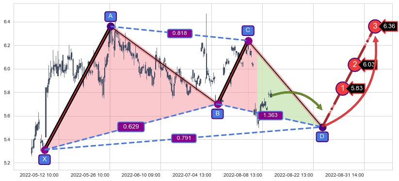 ➢ 距离预测D点位置有足够的上涨空间, 与看跌【伽利】形态相反,实际方向【看涨】
