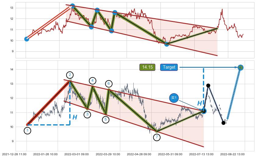 从2022-07-12 14:00至2022-08-12 14:00,共包含47个小时,阶段股价下跌-2.65%,阶段股价变动位移路程比: 1 : 14