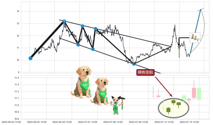 从2022-06-13 10:00至2022-07-12 14:00,共包含58个小时,阶段股价上涨3.34%,阶段股价变动位移路程比: 1 : 18