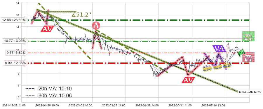 ♘ 阻力价格位10.77,可信任强度68.52%,距离最后交易2022-08-12 14:00形成的收盘价格10.16相差 +6.05%