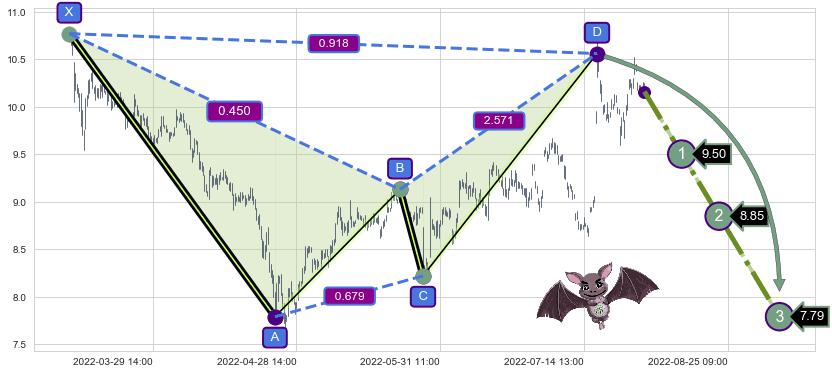 ➣ 已完成【蝙蝠】形态起点X: 03-14:11, 终点D: 07-21:13, 共368交易小时