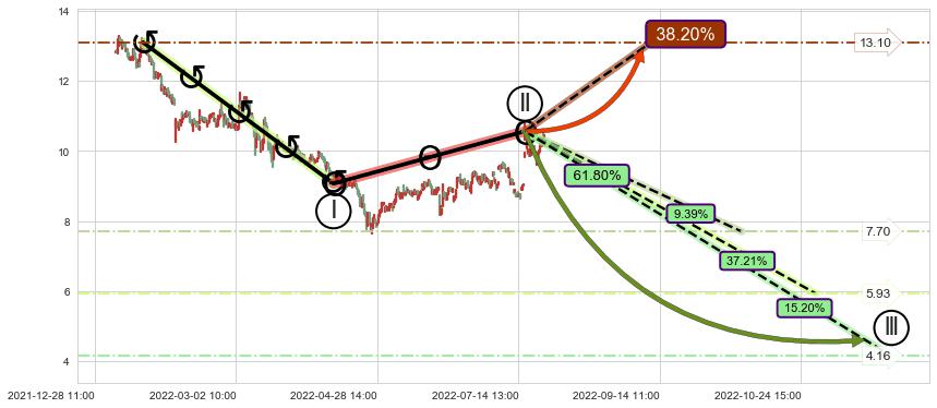 ➣ 调整浪已超过预测的c点位置,后续大趋势循环浪继续下跌概率61.80%,谨慎做多
