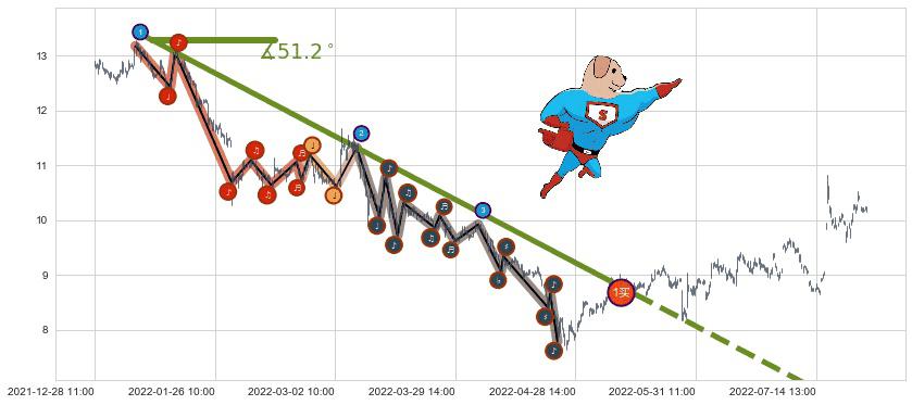 从2022-03-04 11:00至2022-05-11 10:00,共包含218个小时,阶段股价下跌-24.06%,阶段股价变动位移路程比: 1 : 6,下跌趋势角度: 61.7