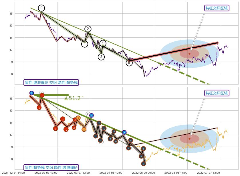 从2022-01-07 10:00至2022-05-11 10:00,共包含395个小时,阶段股价下跌-37.40%,阶段股价变动位移路程比: 1 : 7,下跌趋势角度: 51.2