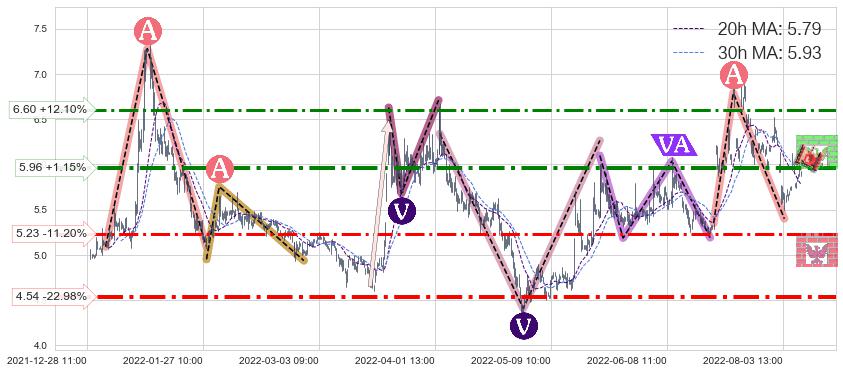 ♘ 阻力价格位5.96,可信任强度82.46%,距离最后交易2022-08-12 14:00形成的收盘价格5.89相差 +1.15%