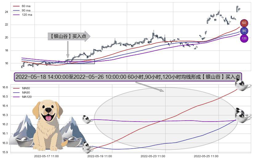 形态多维评估: ⚀ 2022-05-19 09:00:00-小时至2022-05-26 10:00:00-小时显现 60小时-90小时-120小时均线 【银山谷】买入点 看多信号,后市看涨,买入