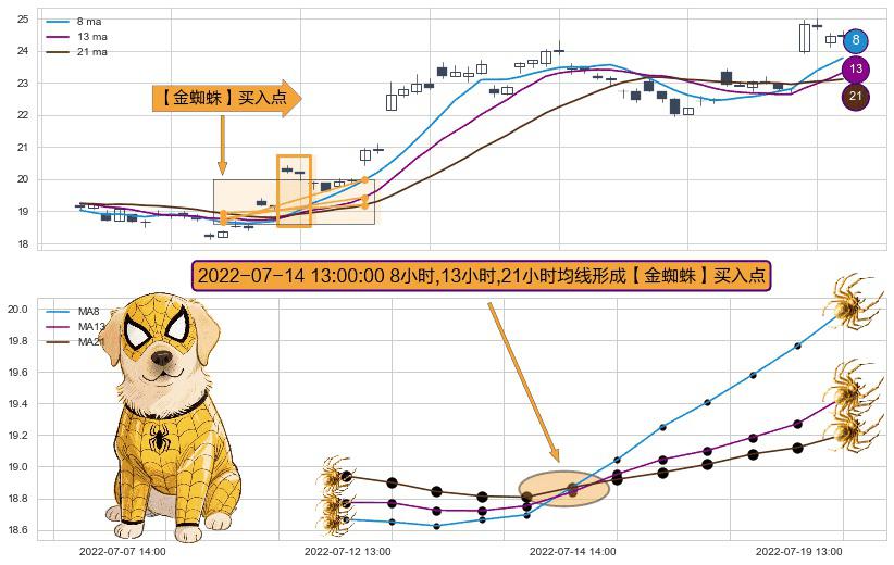 形态多维评估: ⚀ 2022-07-14 13:00:00小时显现 8小时-13小时-21小时均线 【金蜘蛛】买入点 看多信号,后市看涨,买入