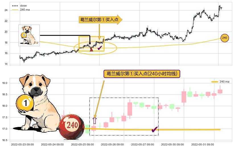 形态多维评估: ⚀ 2022-05-25 09:00:00-小时显现 葛兰威尔均线 240小时均线 第买①入点 走势反转见底信号,后市看涨,买进信号