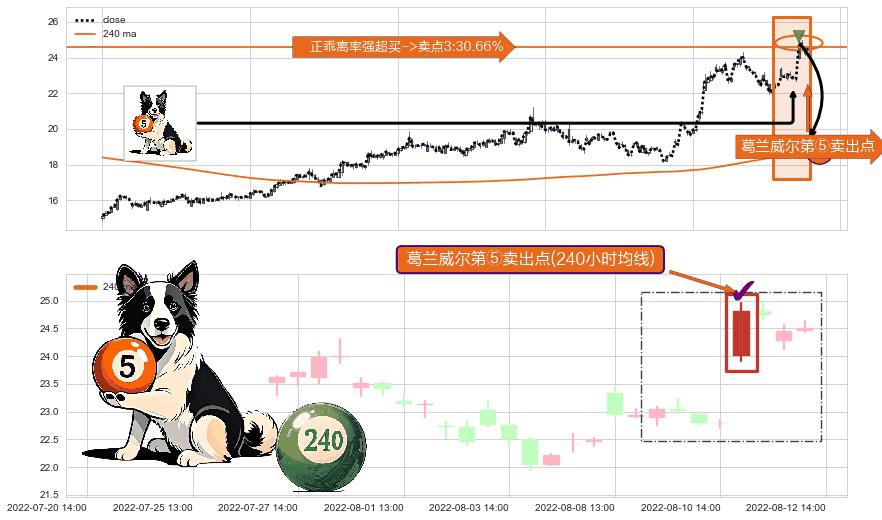 形态多维评估: ⚀ 2022-08-11 13:00:00-小时显现 葛兰威尔均线 240小时均线 第⑤卖出点 上升趋势均值回复的短线回落信号,后市看跌,卖出信号
