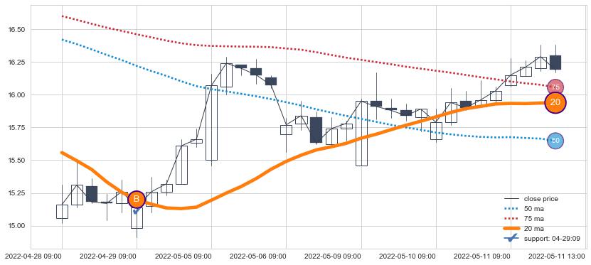 上涨趋势04-28 09:00-05-11 13:00,均线20确认关键支撑1处
