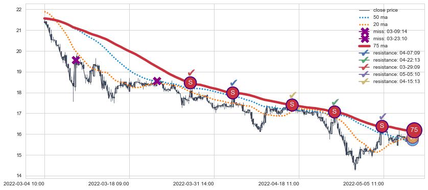 下跌趋势03-04 10:00-05-10 09:00,均线75确认关键阻力5处