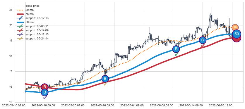 上涨趋势05-10 09:00-06-20 13:00,均线50, 75确认关键支撑4处